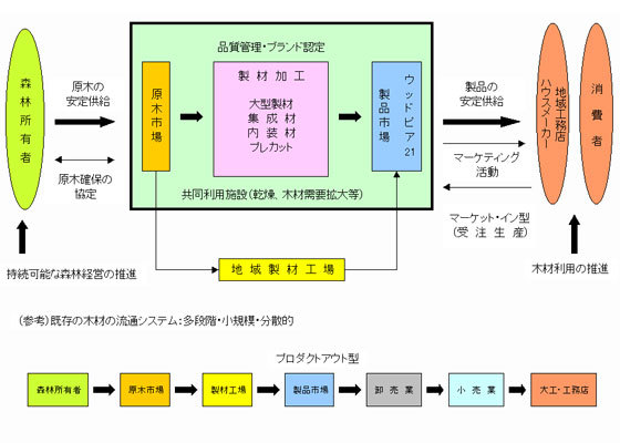 など、住宅産業等の木材供給に対するニーズに合わせた国産材産地を形成するため、21世紀における総合流通加工拠点として各々の機能を連結させた木材コンビナートの整備を図ります。